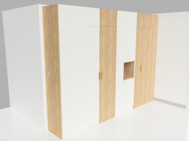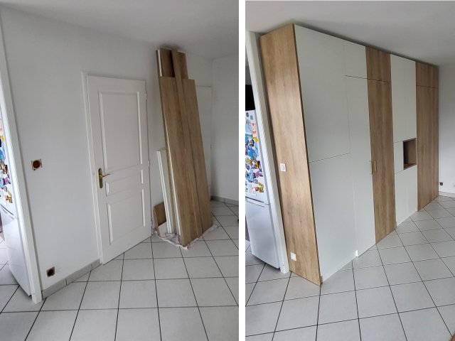Avant / Après - Meuble intégrant deux portes d’accès à un placard mural et au couloir menant aux autres pièces.