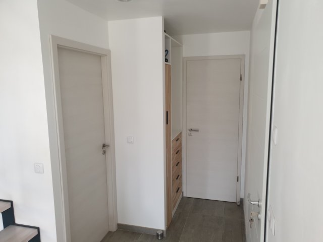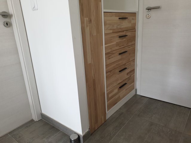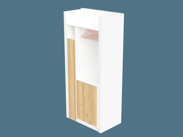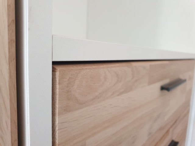 Meuble en aggloméré blanc avec façades en chêne lamellé collé