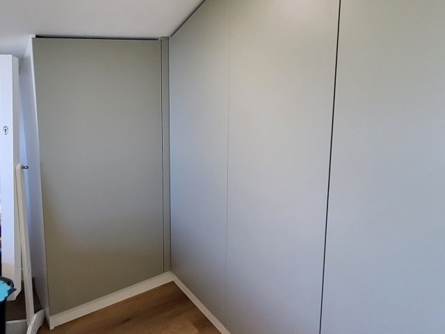 Structure et tiroirs en mélaminé blanc premium, portes en mélaminé vert sauge.