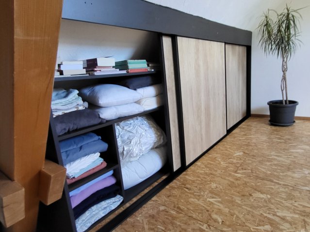 Portes aspect chêne brut avec profils et rails aspect noir sable.
