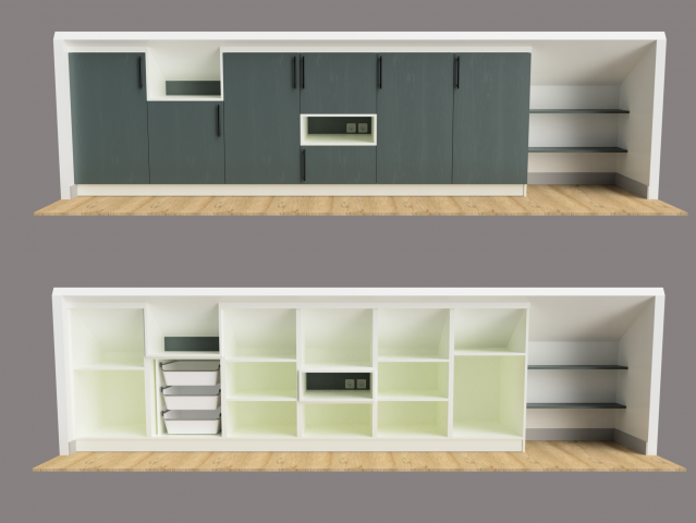 Rendu 3D pour projection des clients (étagères longueur 90 cm fixées ultérieurement par le client).